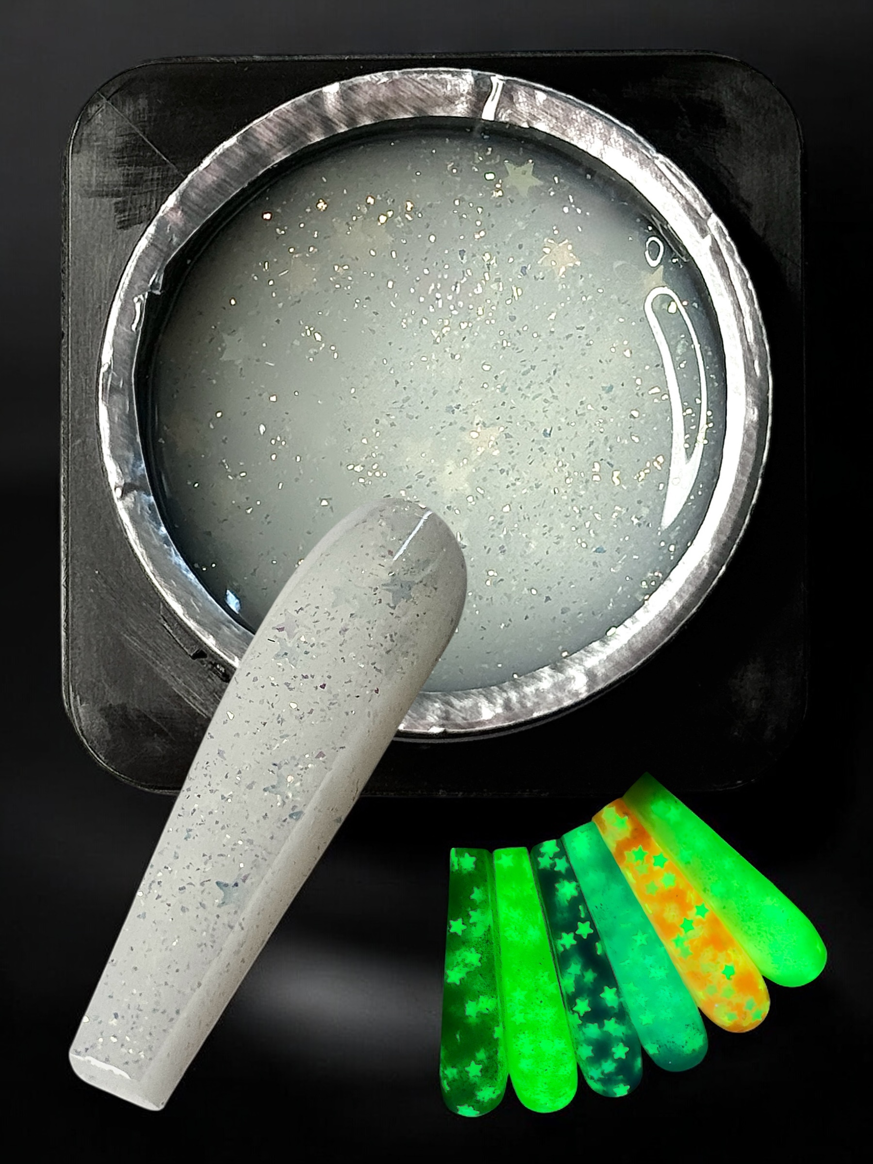 Gelul UV/LED cu stelute și efect fosforescent este un produs de manichiură inovativ, ideal pentru a adăuga un plus de strălucire și efecte vizuale interesante. Acest tip de gel este special formulat pentru a fi utilizat atât cu lămpi UV, cât și cu lămpi LED, asigurând o întărire rapidă și eficientă.