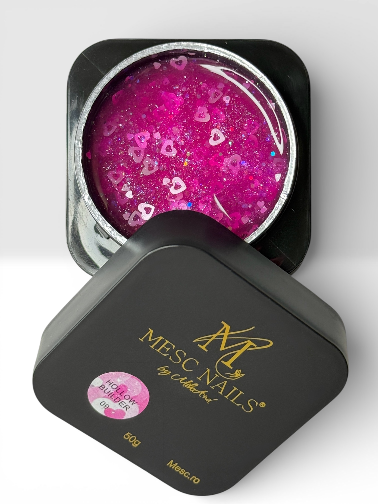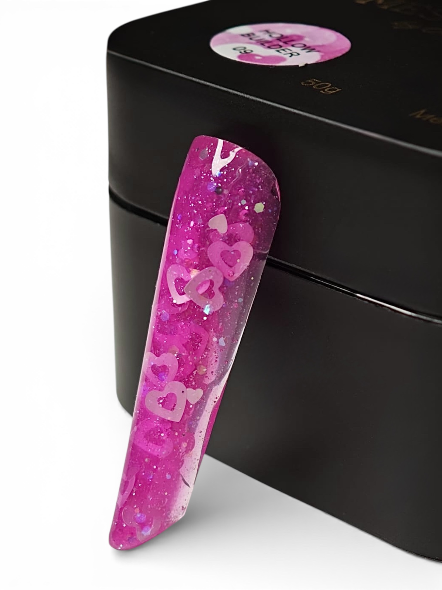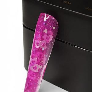 Descoperă un gel UV transparent pink delicat și strălucitor, îmbogățit cu sclipici fin și inimioare decorative, perfect pentru a adăuga un accent romantic și sofisticat manichiurilor tale. Textura sa clară pune în valoare inserțiile decorative, oferind un efect luminos și elegant, fără a încărca unghia.