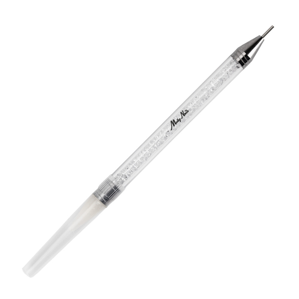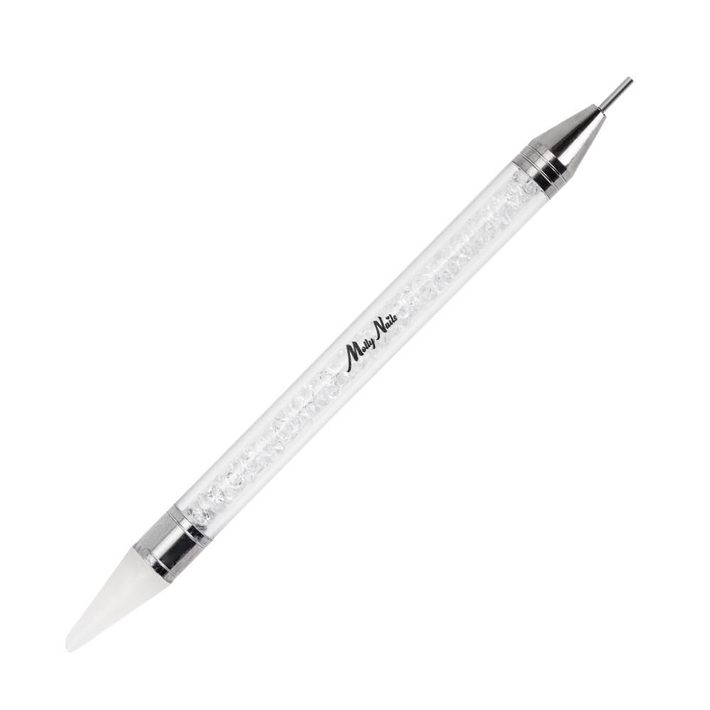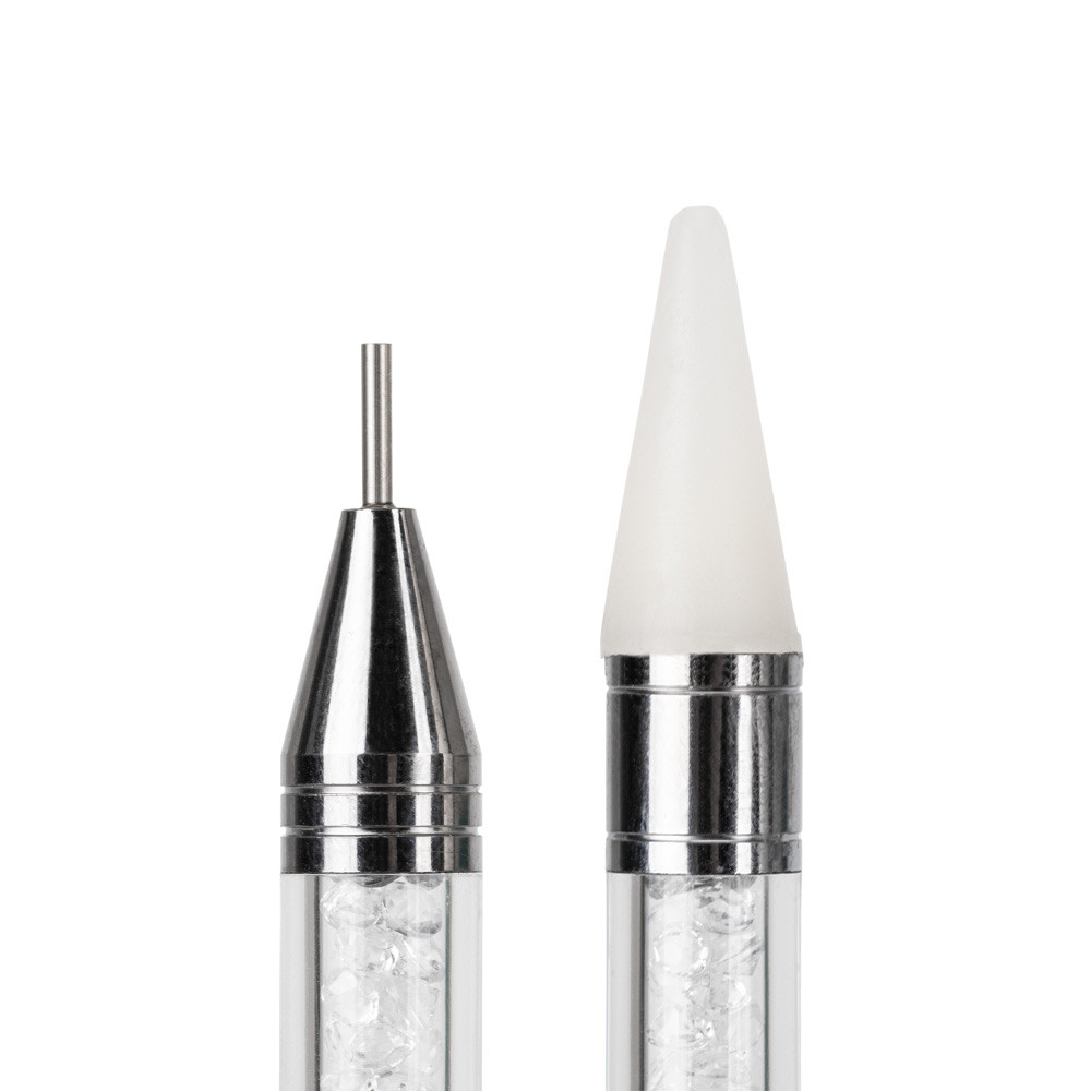 Dispozitiv practic pentru aplicarea de mici decoratiuni. Datorită lui, puteți transfera cu ușurință un anumit decor direct pe placa de unghii. Mânerul lung și confortabil garantează precizie. Vârfurile sunt realizate dintr-un amestec de cauciuc moale, special selectat. Capătul dispozitivului trebuie umezit ușor prin scufundarea acestuia în apă. Apoi atingeți doar zirconul, știftul sau alt decor și acesta va fi atașat ușor. Acum puteți începe aplicarea precisă a decorului.