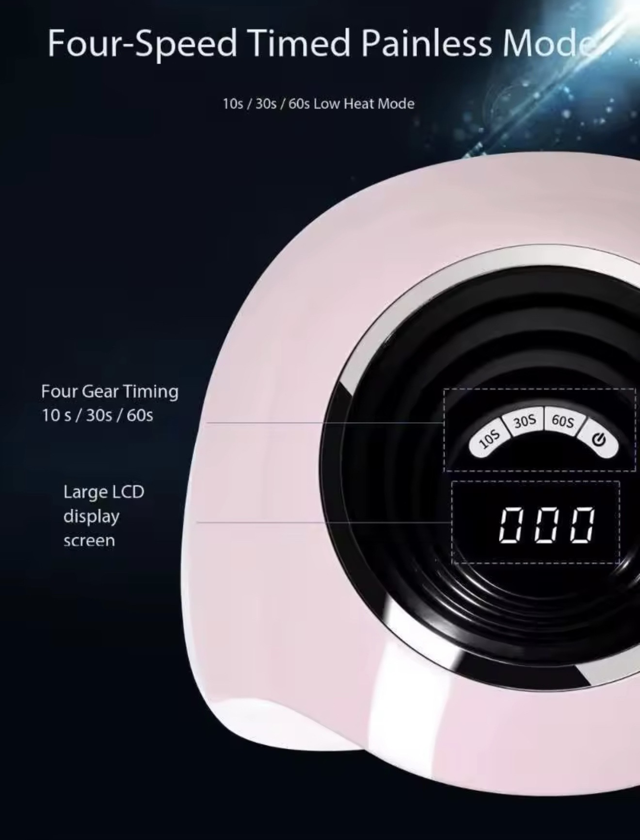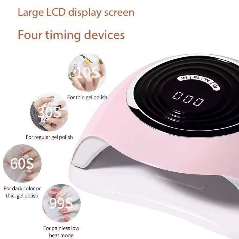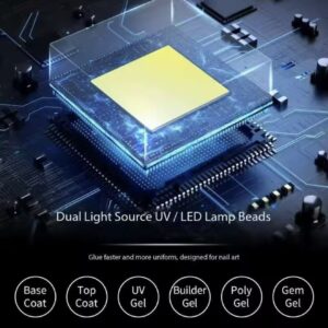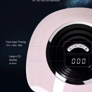 Lampa are patru moduri de funcționare: 10, 30 și 60 de secunde, plus un mod Low Heat pentru încălzire treptată, util pentru întărirea gelurilor de construcție. Un afișaj electronic mare cu cronometru vă permite să controlați timpul de expunere.