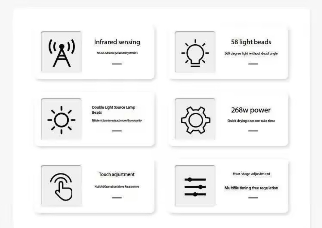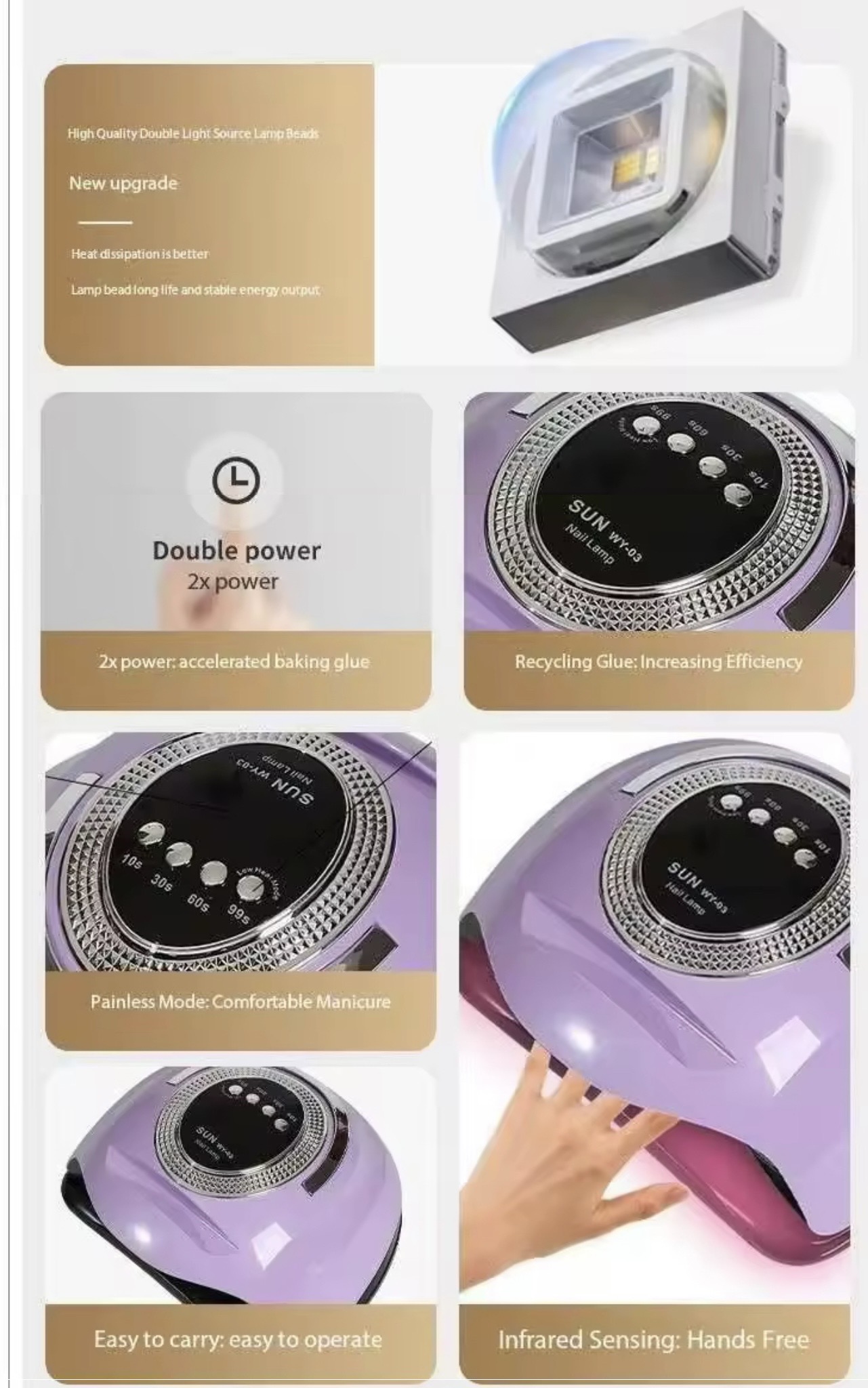 Lampa are patru moduri de funcționare: 10, 30 și 60 de secunde, plus un mod Low Heat pentru încălzire treptată, util pentru întărirea gelurilor de construcție. Un afișaj electronic mare cu cronometru vă permite să controlați timpul de expunere.